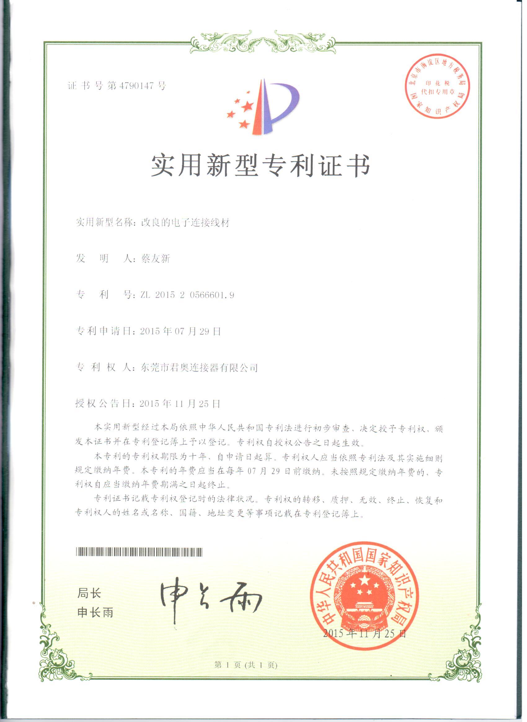 • 改良(liáng)的電子連接線材專利證(zhèng)書