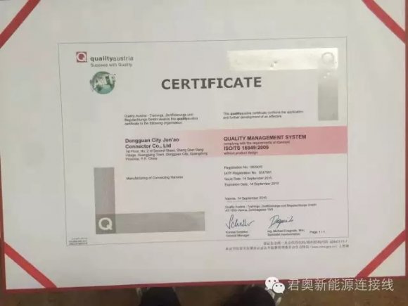 TS16949證書是我公司新能源(yuán)汽車連接線給(gěi)國內整車製造商(shāng)提供(gòng)產(chǎn)品的必備條(tiáo)件,也是17c.com在线观看新能源(yuán)汽車連接線產(chǎn)品進入國際汽車市場的通(tōng)行證,獲得此次審核(hé)的順(shùn)利通過,為我公(gōng)司的質(zhì)量體係持續改進及完善提供很多有效的方法,同時也標(biāo)誌著我公司的質量管理水平有(yǒu)邁上了一個新的台階,進一步改進了公司各項過程績(jì)效指標,為提高客戶關注度打下堅實的基礎(chǔ)。