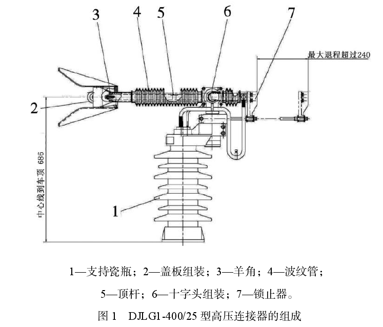 高壓連接器廣泛用於交流和直流八(bā)軸電力機車,主要由支持瓷瓶、蓋板組裝、羊角、波紋管(guǎn)、頂杆、十字頭組裝、鎖止(zhǐ)器等組成,如圖(tú)1所示(shì)。其主要功能是實現八軸電力機車A節和B節車頂高壓電路的可靠連(lián)接,並(bìng)可在司機室中(zhōng)實現控製,避免危險的車頂(dǐng)作業發生。在批(pī)量生產中,偶爾會出現兩個對接的高壓連接器分離後無法再次對接的情況。
