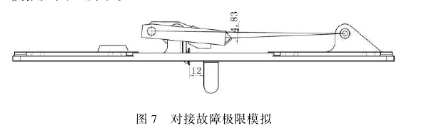 圖7表明當鎖舌與蓋(gài)板的寬度等於環的直徑(12 mm )時,卡箍與彈簧連接軸的位置比正常(cháng)的位置向上移(yí)動4.83 mm。此時,卡(kǎ)箍與彈簧連接軸(zhóu)、卡箍與(yǔ)鎖舌連接軸、蓋板與(yǔ)鎖舌連接軸三(sān)者處於(yú)同一直(zhí)線,達到平衡。這是(shì)對接(jiē)故(gù)障發生的臨界點,所以,當卡箍變形使卡箍與彈(dàn)簧(huáng)連接軸向上移動(dòng)大於4.83 mm,就會發生對(duì)接故障。對接故障極限(xiàn)模擬如圖7所示。