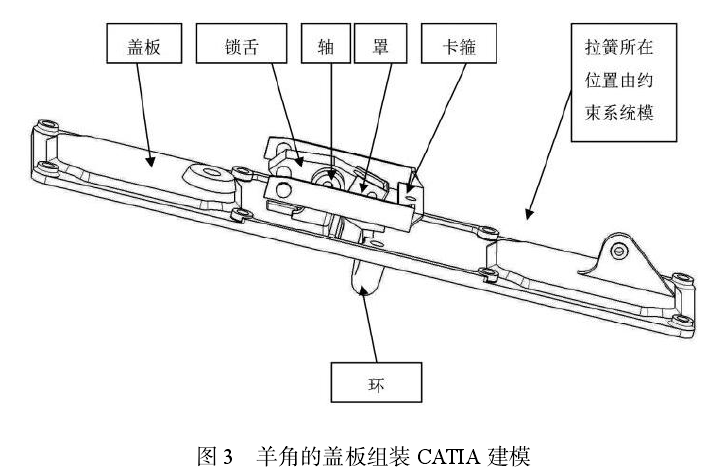 以下用CAT工A三維建模分析卡箍變(biàn)形對高壓連(lián)接器產生的影響。對(duì)羊角中卡(kǎ)箍及相關零件進行CAT工A三維(wéi)建模並組(zǔ)裝、約束,如(rú)圖3所示(彈簧通過CAT工A的約束係統模擬)。從圖3中可以看出拉簧(huáng)與(yǔ)蓋板由軸連接,卡箍與拉簧由軸連接,卡箍與鎖舌由軸連(lián)接,蓋(gài)板(bǎn)與鎖舌由軸連接,組成一個複雜的四連(lián)軸結構。
