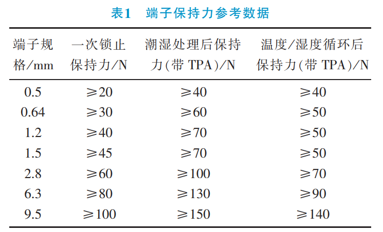 1) 端(duān)子保持力(lì)偏低。端子保持力衡量的是端子在護套中掛接可靠性(xìng)。根據汽(qì)車行業最新標準QC / T1067.1-2017要求,不(bú)同(tóng)規格端子需要滿足不同的保持力(lì)要求。端子(zǐ)保持力過低,會導致端子(zǐ)在護套中的掛接(jiē)可靠性下降。特別是在車身運動過程中,端子受到(dào)電線束的牽引力增加,如果端子保持力偏小,會導致端子(zǐ)從護套中脫出,從而導致連(lián)接器的傳輸失效。端子保持(chí)力標準見表1